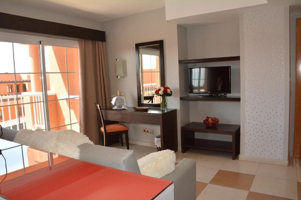 La habitación Junior Suite está diseñada para darles más confort y espacio en su estancia en Hotel Costa Caleta. A diferencia de las habitaciones estándares, la Junior Suite es más amplia y tiene aproximadamente 44m2. Cuenta con una zona de estar, TV de pantalla plana, armario más grande, nevera y cuarto de baño completo con bañera y bidet. Además, se ofrece al cliente detalle de bienvenida a la llegada.